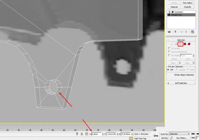 Шаг-30.Теперь можно перейти на уровень полигонов, выделить правую часть полигонов модели и удалить её. Далее нужно перейти на уровень Vertex и удалить лишние точки на местах вырезов, которые оставил Boolean. После этого, применить модификатор Symmetry. Перед симметрией также необходимо выставить систему координат (Pivot Point). Этот шаг сделайте самостоятельно.