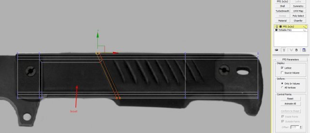 Шаг-40.Теперь моделируем саму форму ручки. Для удобства делаем данный объект полупрозрачным, удлиняем его, добавляем дополнительный рёбра, выделяем нужные полигоны и делаем им Inset. После этого формируем угол наклона с помощью модификатора FFD 2x2x2, после чего делаем коллапс данному модификатору.