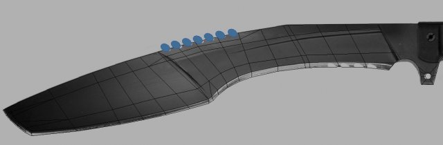 Шаг-9.Теперь добавим недостающие полигоны снизу лезвия. Напомню как это сделать: на уровне Edge выбираем нужные рёбра и, удерживая клавишу Shift, вытягиваем полигоны по нужной оси. Не забудем также соединить точки в одну там, где нужно, с помощью команды Weld.