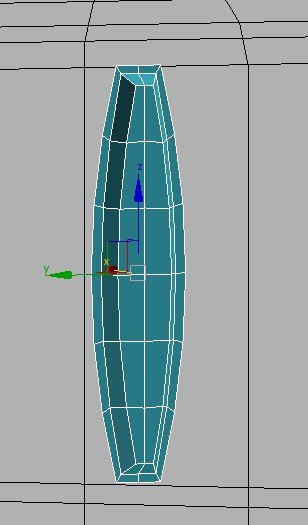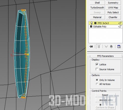 Шаг-38.Перейдём на уровень Edge, выделим центральное ребро объекта и применим модификатор FFD 3x3x3. Активируем Control Points, выделим центральные точки модификатора и немного выдвинем их вперёд, чтобы придать выпуклость объекту. После этого делаем коллапс модификатора FFD 3x3x3.
