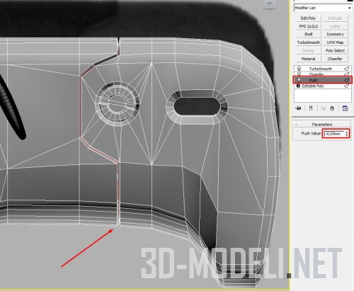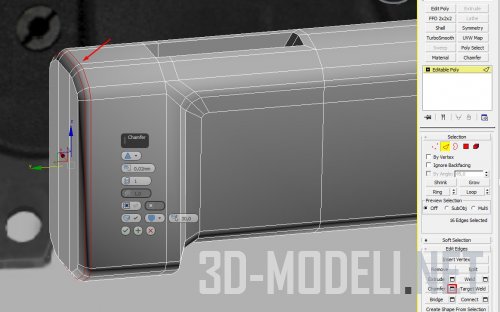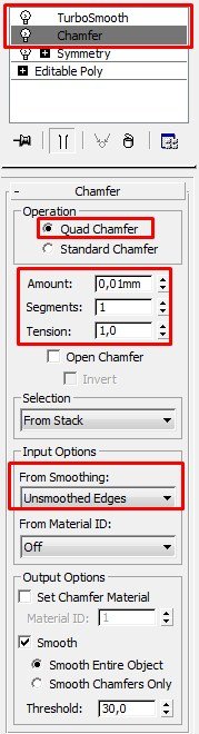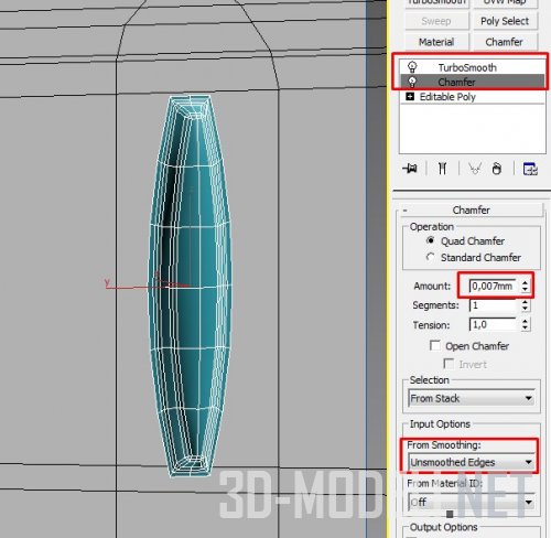 Начнем с модификатора Chamfer. Настраиваем его так, как показано ниже, и комбинируем его с модификатором TurboSmooth , в котором выставляем 2 итерации.