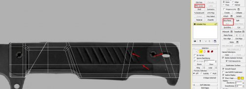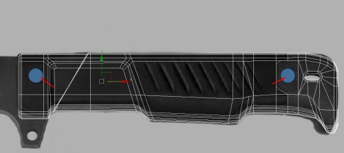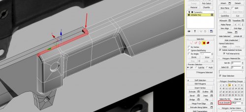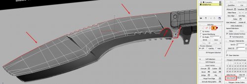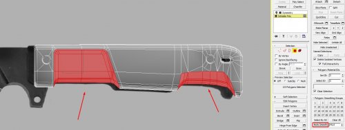Шаг-20.Немного изменим верхнюю часть рукоятки, куда входит лезвие ножа. Затем выделим указанные полигоны и назначим им группу сглаживания Auto Smooth.