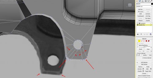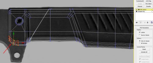 Шаг-21.Делаем Collapse модификатора symmetry, после этого переходим на уровень Vertex и выделяем указанные точки объекта. После этого применяем модификатор FFD 2X2X2 и выбираем задние точки по оси X. После этого не делаем Collapse модификатор FFD.