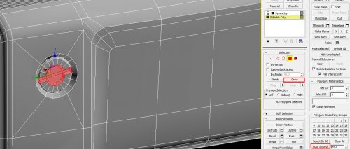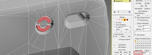 Шаг-16.Теперь выделяем полигоны всех наших вырезов, как показано ниже, и нажимаем на кнопку Auto Smooth.