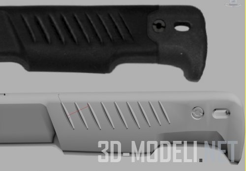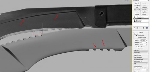 Шаг-30.Итак, что я сделал для того, чтобы избавиться от данных артефактов в нижней части лезвия. Я соединил каждую точку ребрами, и этого хватило чтобы модель выглядела более приемлемо. Второй недочет, который я упустил ранее, и это видно на референсе, то есть в нужном месте я добавил дополнительное ребро с помощью инструмента Cut, затем я раздвоил данное ребро с помощью инструмента Chamfer, затем выделил только нижнее ребро из этих двух рёбер и немножко сдвинул его вглубь, после чего выделил полигоны лежащие между этими двумя рёбрами и назначил им Auto Smooth.