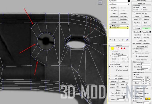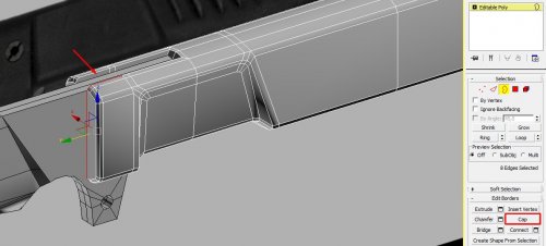 Часть 1Шаг-1.Продолжаем моделирование ручки. И первым делом что мы сделаем, это перейдём на уровень Vertex, выделим передние точки модели для того, чтобы их выровнять по оси Z. Далее закроем дырки на модели. Для этого переходим на уровень Border, выделим границу, где нужно добавить полигон и нажимаем на кнопку Cap.