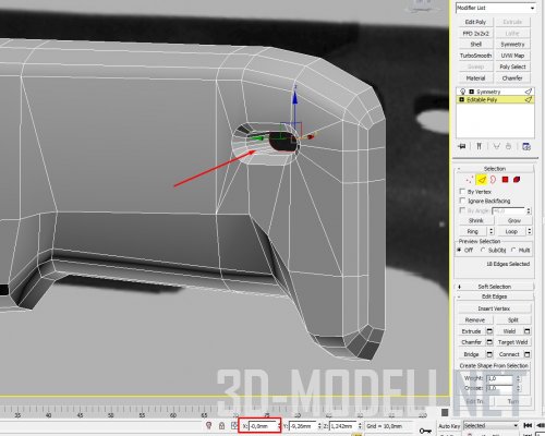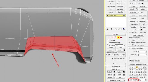 Шаг-9.Выйдем с обеих сторон полигоны данного углубления и сделаем им сглаживание, нажав на кнопку Auto Smooth.