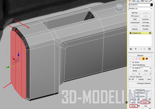 Шаг-2.Далее удаляем внутренние два полигона для того, чтобы сделать вот такое соединение, как показано ниже. Соединения эти делаются с помощью команды Bridge. После этого выделяем передние полигоны и делаем им Inset, после чего немного вытягиваем перевод.