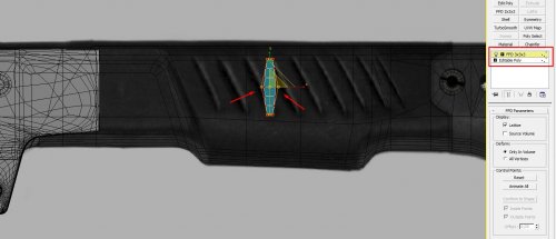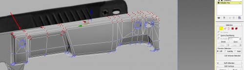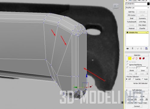 Шаг-23.Идём далее. Перейдём в вид Top и удалим правую часть модели. Теперь можно смоделировать левую часть рукоятки. Для этого добавим 3 дополнительных ребра, затем перейдем в режим Vertex, выделим необходимые точки, как показано ниже и применим к ним модификатор ffd 3x3x3, затем активируем и поднимем необходимые точки вверх. После чего делаем коллапс модификатор ffd 3x3x3.