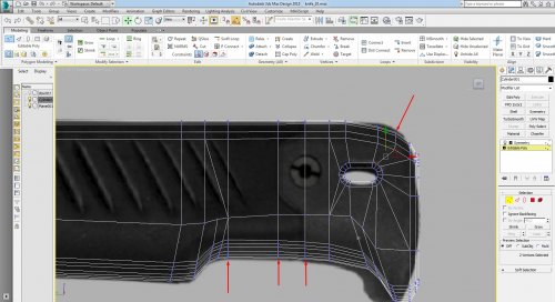 Шаг-12.На данный момент нижняя часть рукоятки у нас выглядит угловато. Чтобы это исправить, давайте добавим несколько дополнительных ребер. Однако мы это сделаем не стандартным методом с помощью кнопки Connect, а воспользуемся дополнительным раскрывающемся меню 3DS Max, которое появляется при нажатии на кнопку Toggle Ribbon.
