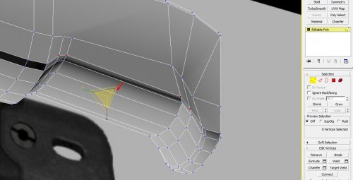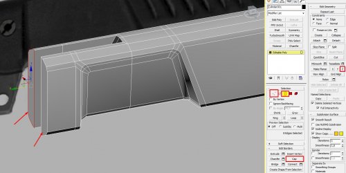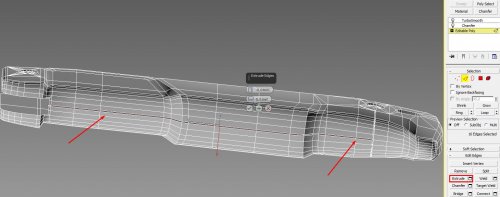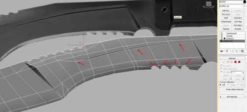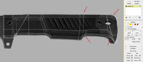 Шаг-6.Далее формируем вторую половину на рукоятке. Для этого где нужно применяем Chamfer, где нужно добавляем еще дополнительные рёбра. После того, как необходимый изгиб сформирован, почистим немного геометрию, где нужно - применим кнопку коллапс. Также не забудем закрыть заднюю дырку полигоном с помощью кнопки Cap. В результате должно получиться так, как показано ниже.