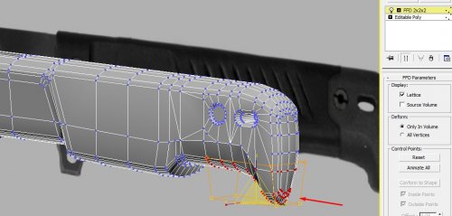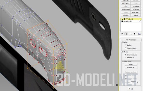 Шаг-22.Выбираем точки нижней части рукоятки, применим к ним модификатор FFD 2x2x2, затем активируем Counter Point и сужаем их немного по оси X. После чего делаем коллапс модификатора FFD 2x2x2.