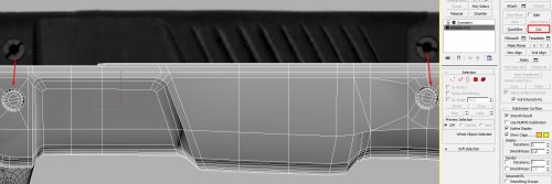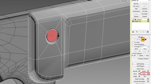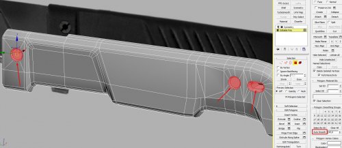 Начнём мы с 2-х круглых отверстий, которые необходимо видоизменить. Для этого переходим на уровень полигонов, выделяем данные полигоны и делаем небольшой Inset, после чего немного выдавливаем полигоны наружу. Не забудем также задать новым полигонам группу сглаживания Auto Smooth.