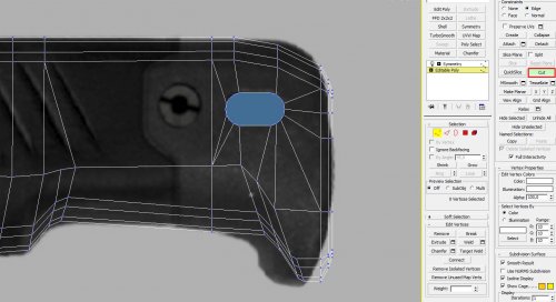 Шаг-10.Теперь займемся созданием сквозной дырки на рукоятке. Для этого удалим рёбра, которые нам мешают и создадим дополнительные рёбра. Далее создадим вспомогательный объект из цилиндра, конвертируем его в Editable Poly и изменим его по размеру дырки на референсе. После этого необходимо включить привязку по вершинам Vertex, нажать на кнопку Cut и вырезать по вспомогательному объекту. В результате должно получиться следующие. После этого, вспомогательный объект можно удалить.