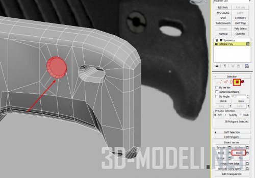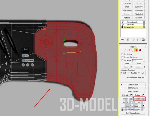 Шаг-41.Переходим на уровень полигонов и выделим следующие полигоны. После этого сделаем небольшой Inset.