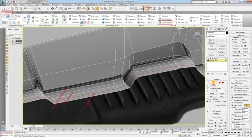 Шаг-13.Добавим ещё несколько дополнительных ребер для формирования более плавного изгиба в нижней части объекта. Также добавим ещё одно ребро с помощью кнопки Flow Connect в верхней правой части модели.