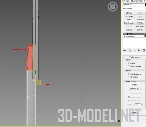 Итак, приступим. Переходим к виду слева и для удобства делаем объект рукоятки прозрачным. Далее создаем новый объект Plane с нужной высотой и конвертируем его в Editable Poly. С помощью команды Connect добавляем 5 дополнительных ребер. После чего, выделяем все точки объекта и применяем модификатор FFD 3x3x3, активируем о модификатора Control Points, выделяем центральные точки и немного их расширяем по оси X. После этого делаем коллапс модификатору FFD 3x3x3.