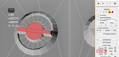 Шаг-33.Далее выделим полигон указанные ниже на двух отверстиях и применим к ним инструмент Bevel.